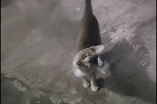 Kondisi kepala kucing yang miring 180° derajat pada saat menghampiri si perekam vidio,yang dimana kepala kucing melihat ke Atas secara memutar.